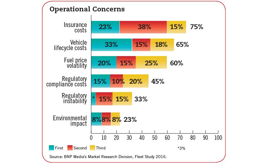 Trading places in the first- and second-place ranking, insurance cost and vehicle lifecycle costs continue to outrun other operational concerns by a wide margin. This heightened cost-sensitivity likely reflects the smaller company size of this year’s respondents.