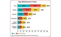 Respondents were asked to rank their Top 3 maintenance costs. Tires continue to be ranked as the top maintenance cost for the majority of our respondents with 63 percent indicating this as their top cost. It was indicated as a No. 2 cost by 11 percent and No. 3 by another 11 percent. A total of 85 percent of respondents placed tires in their Top 3 maintenance costs. In comparison to last year’s study, brakes were the No. 2 cost, ranking in the Top 3 for 75 percent of respondents. This year, the expense moved down to fourth on the list with only 47 percent of respondents placing it in their Top 3. Engine maintenance curiously has moved up to second place, likely driven by the continued trend toward longer replacement cycles.