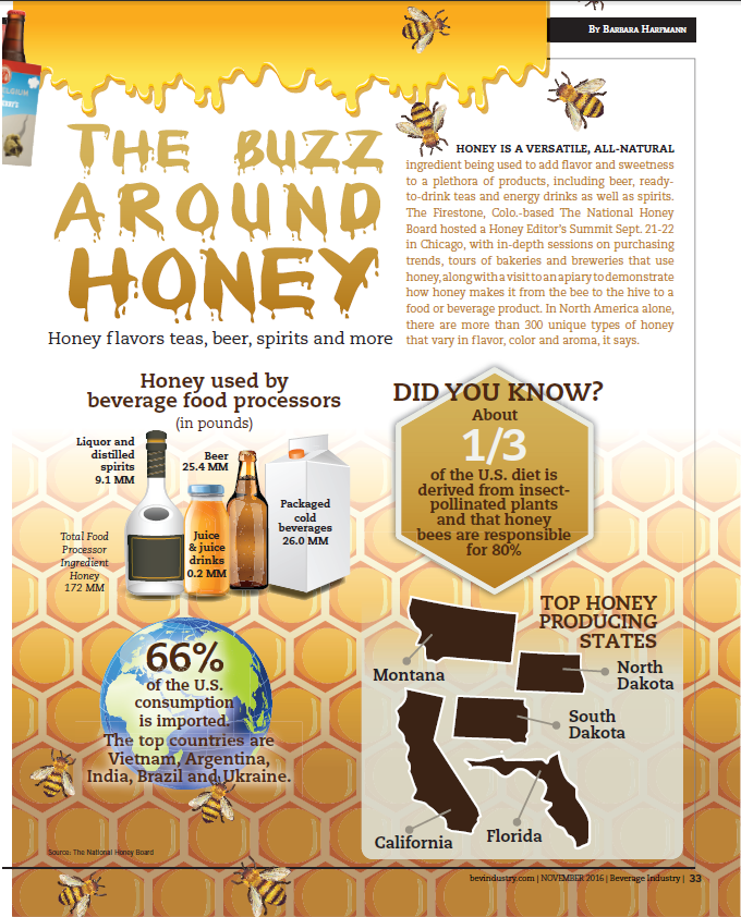 Honey is a versatile, all-natural ingredient being used to add flavor and sweetness to a plethora of products, including beer, ready-to-drink teas and energy drinks as well as spirits. Firestone, Colo.-based The National Honey Board hosted a Honey Editor’s Summit, Sept. 21-22 in Chicago, with in-depth sessions on purchasing trends, tours of bakeries and breweries that use honey, along with a visit to an apiary to demonstrate how honey makes it from the bee to the hive to a food or beverage product. In North America alone, there are more than 300 unique types of honey that vary in flavor, color and aroma, it says.