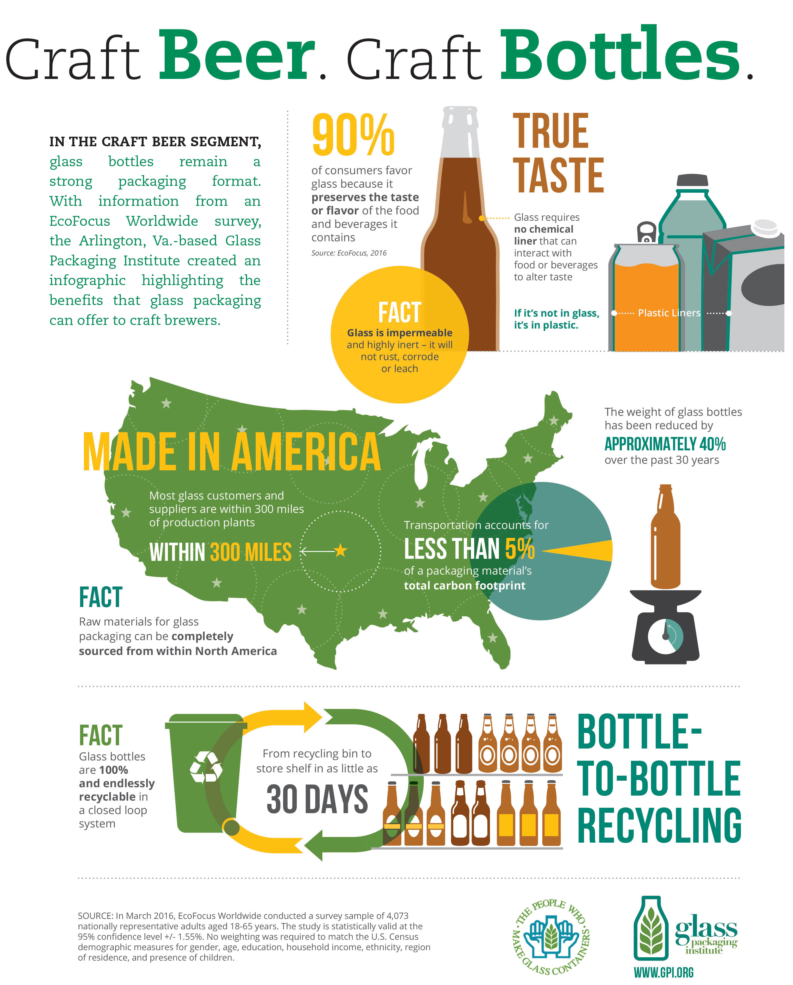 In the craft beer segment, glass bottle packaging remains a strong packaging format. With information from an EcoFocus Worldwide survey, the Arlington, Va.-based Glass Packaging Institute created an infographic highlighting the benefits that glass packaging can offer to craft brewers.