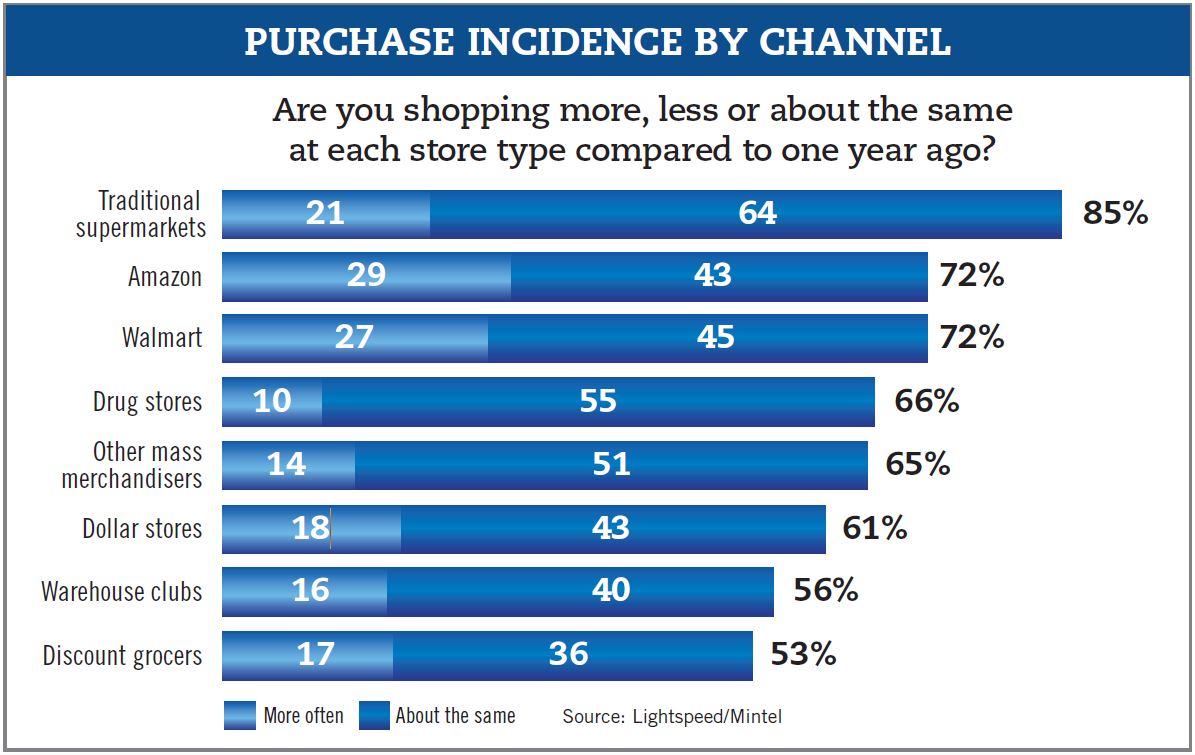 “Mintel’s grocery shopping data shows that 93 percent of consumers are shopping the same or more at supermarkets or grocery stores (even higher than last year’s reported figures) but differences in frequency or spending (likely due to lower food prices) could be impacting sales,” it states. “Amazon and Walmart are seeing the highest percentages of consumers claiming to ‘shop more’ — 29 and 27 percent, respectively.”
