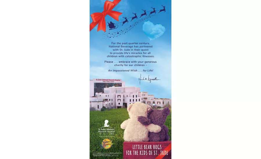 “I believe it is our profound obligation to share our blessings by supporting the deserving children of St. Jude. I have been honored to personally witness the remarkable strides in research and treatment St. Jude Children’s Research Hospital has made over the past 25 years . . . and I can attest there is no more gratifying holiday gift possible,” said Nick A. Caporella, chairman and chief executive officer of National Beverage Corp., in a statement. “If I could conjure up some holiday magic, I would give each precious child under the care of St. Jude a ‘little bear hug’. Since that is not possible, I ask everyone to open your hearts and generously support St. Jude. Let us share the abundant joy we receive . . . through giving to our children.” Caporella said.