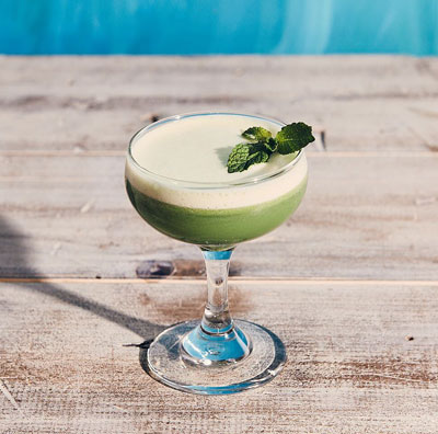 Another interesting cocktail created by Salas is the Matcha Made in Heaven. Matcha Made in Heaven includes 2-ounces of Milagro Silver, three-fourths part matcha green tea syrup, three-fourths part lemon and half an egg white. The cocktail is designed to be built in the glass and topped with micro mint lime, he says.