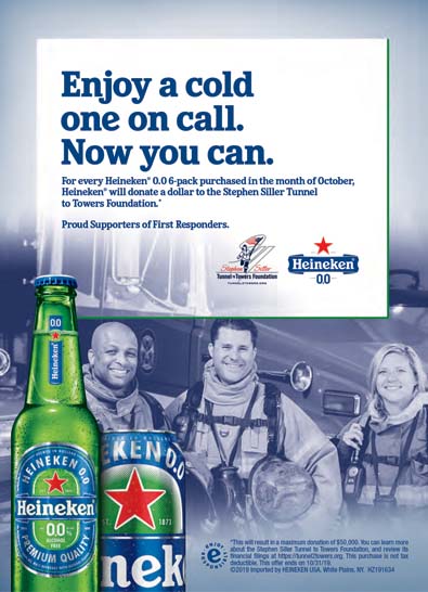 To mark First Responders Day on Oct. 28, Heineken donated $1 for every Heineken 0.0 six-pack purchased at retail, or a $1 for every bottle or can purchased in on-premise accounts during the month of October. The donation, up to $50,000, will benefit the Stephen Siller Tunnel to Towers Foundation that honors the sacrifice of Stephen Siller who laid down his life to save others on Sept. 11, 2001, and honors military and first responders, the company says. “Regardless of the nature of the call, first responders never know what they’re heading into until they get there,” said Meredith Kiss, brand manager for Heineken USA, in a statement. On Sept. 29, the non-alcohol Heineken 0.0 lager also supported the Tunnel to Towers 5K Run & Walk NYC, which symbolizes Siller’s final footsteps to the Twin Towers site and pays homage to the New York City Fire Department firefighters, law enforcement officers and civilians who lost their lives on Sept. 11, 2001.