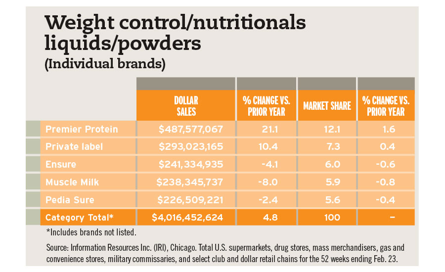 For the 52 weeks ending Feb. 23, the weight control, nutritional liquids and powders category netted sales of more than $4 billion, a 4.8 percent increase over 2019, IRI data states. With 12 percent of market share, Premier Protein is the category’s growth leader with $487 million in sales and double-digit growth of 21 percent. Clocking in at No. 2, private-label brands grew 10.4 percent and saw sales of $293 million.