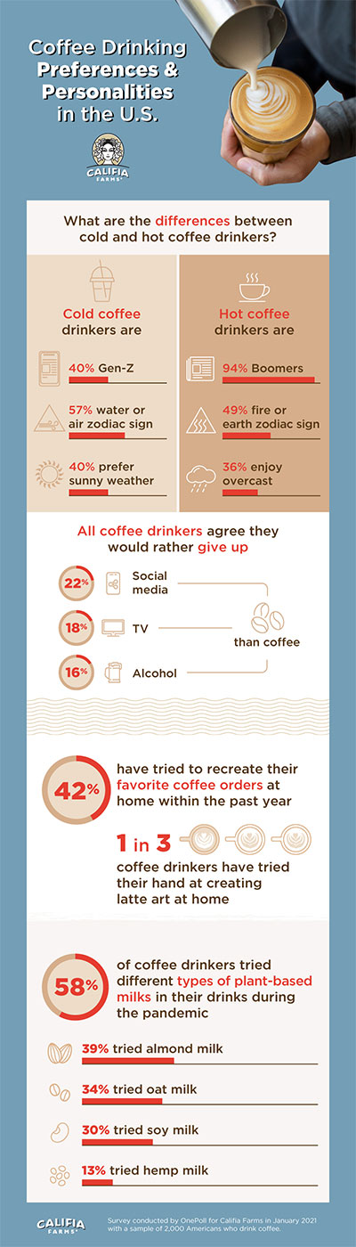 The study, which surveyed 2,000 American coffee drinkers, compared the lifestyles of hot coffee and cold coffee drinkers. Among the noteworthy results, the survey found that those who prefer cold brew and iced coffee are more likely to prefer sunny weather (40 percent), binge-watch science-fiction shows like Unsolved Mysteries (37 percent), and are more likely to be part of the Gen-Z demographic (40 percent).
