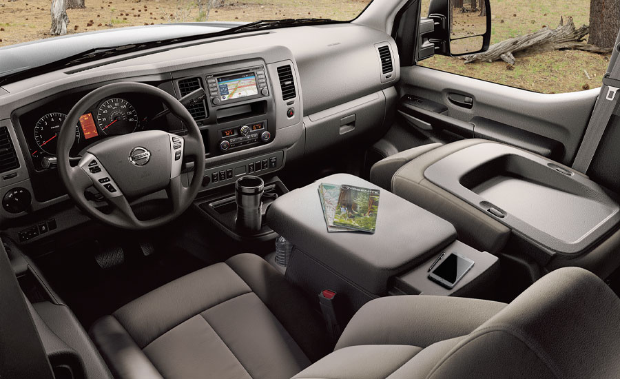 Comfort was top-of-mind for Nissan when designing its NV Cargo van line — particularly because it’s been conceived as a mobile workshop and office. The wide front doors provide easier ingress and egress and the supportive bucket seating offers extensive adjustability to accommodate the comfort needs of virtually every driver. The NVs also boast larger armrests, as well as ample legroom and foot room. The absence of a so-called van engine “doghouse” also frees up considerable space under the instrument panel. Typically, the setback placement of the engine in a van would intrude significantly into the cab, but the NV Cargo employs a conventional truck engine layout with out-front engine design, to return that historically encroached-upon space to the driver.