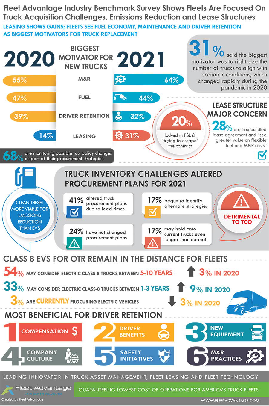 Fleet Advantage, an innovator in truck fleet business analytics, equipment financing and lifecycle cost management, released its latest fleet industry benchmarking survey showing how trends in fuel economy, maintenance, environmental concerns and procurement strategies have changed this past year.
