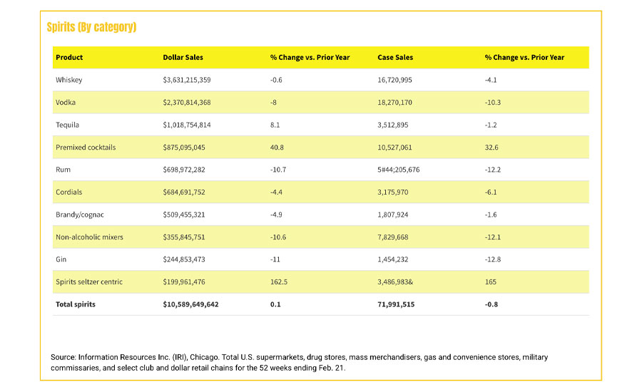 With sales of $875 million and growth of nearly 41% in multi-outlets for the 52 weeks ending Jan. 23, premixed cocktails are a bright spot in the spirits category, according to data from Information Resources Inc. (IRI), Chicago.