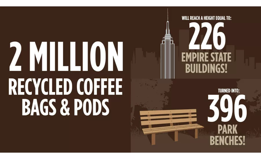 The company has recycled more than 2 million used coffee bags, single-serve coffee pods and espresso capsules through its Coffee Bag and Pod Free Recycling Program with global recycling company TerraCycle. If all those items were stacked together, they would reach a height equal to 226 Empire State Buildings and the recycled material can be used to create 396 park benches.