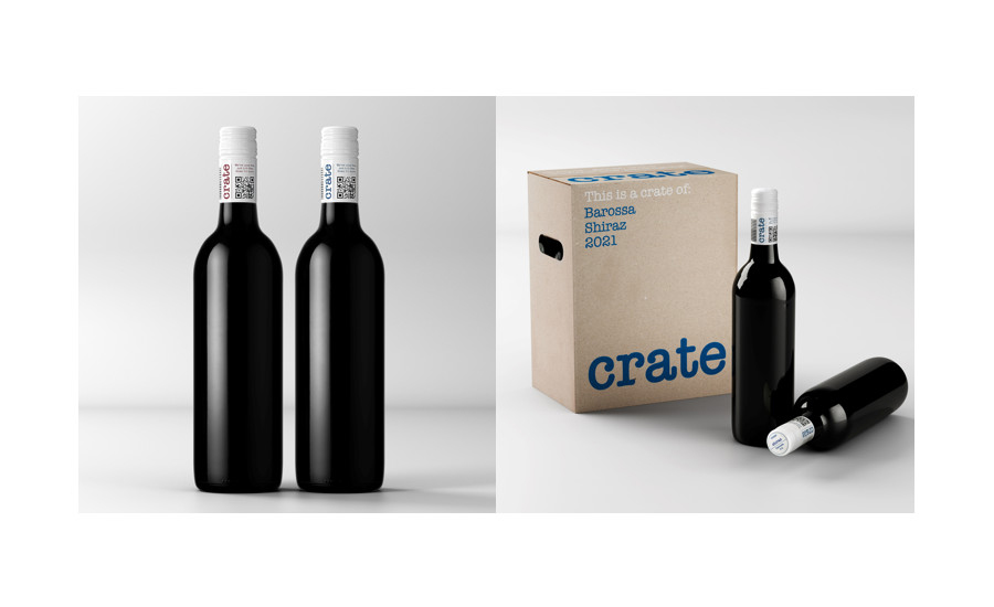 The tiny space of a capsule holds all the essential brand information for Crate, containing mandatory information, brand logotype, varietal, region, vintage, legal claims, barcode, brand messaging and a QR code for more information. The packaging uses typography to give the illusion of space.